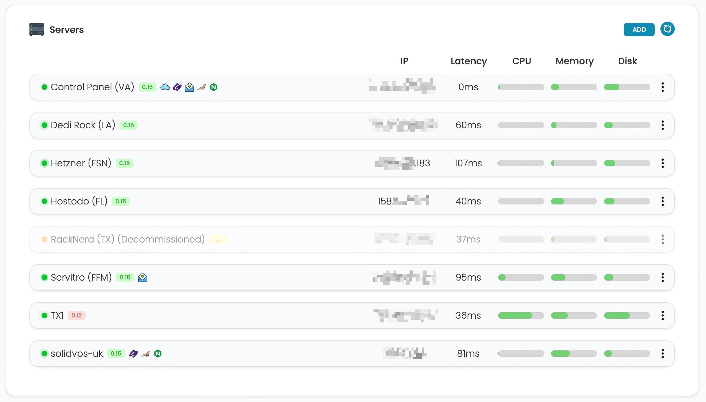 The servers page is an overview of all current servers within your platform. You can quickly see the following information: