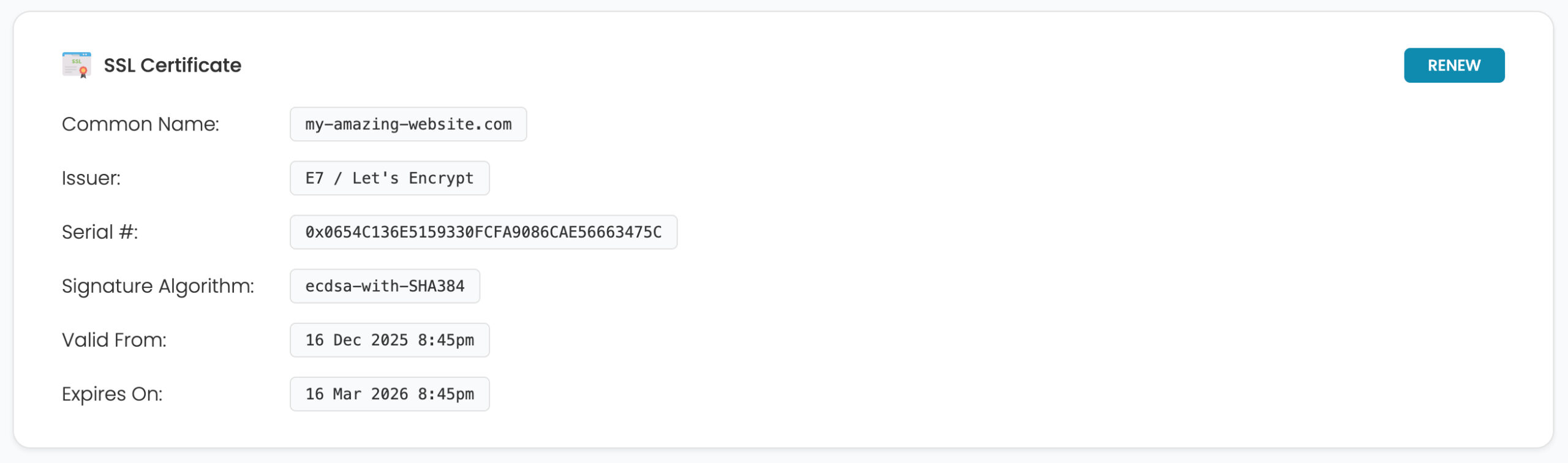 Users can view information about their SSL Certificate on this screen. If they wish to renew the certificate they can do so by pressing the Renew button. A certificate can only be renewed within the renewal period.